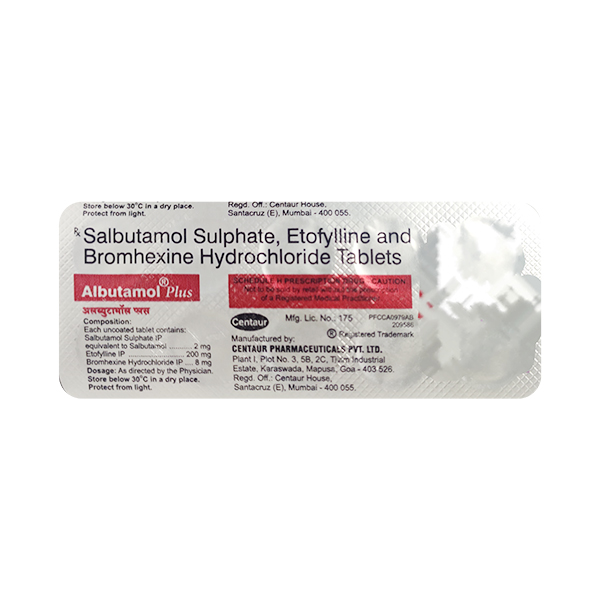 ALBUTAMOL PLUS TABLET is a combination of Bromhexine, Etophylline and Salbutamol which belong to the groups of medicines called Mucolytic and Bronchodilators. It is used to relieve bronchospasm due to asthma or chronic obstructive pulmonary disease (COPD) in adults and children 6 years of age and older.