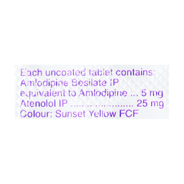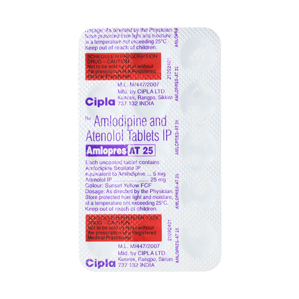 AMLOPRES AT 25MG TABLET contains two medicines namely amlodipine and atenolol. Atenolol blocks the effects of certain hormones (adrenaline) in the body that naturally increases heart rate. This slows down the heartbeat and makes the heart to pump blood with a lesser force.