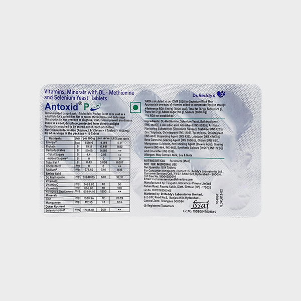 Antoxid P Tablet is a dietary supplement used to meet up the nutritional requirements in the body. It contains vitamins, minerals, methionine and selenium as active ingredients that helps in the normal growth and functioning of the body.