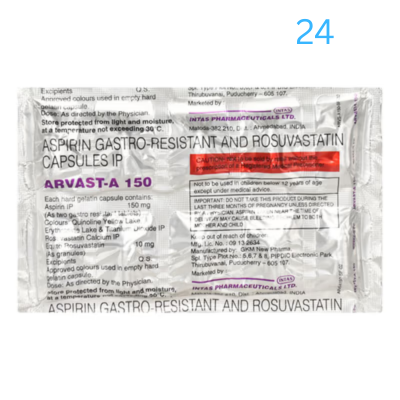 Arvast-A 150 Capsule also contains a blood thinner, aspirin, that prevents the formation of blood clots and the existing ones from growing bigger in size. Take it regularly and make appropriate lifestyle changes (such as eating healthy and staying active) to maximize the effectiveness of this medicine. Keep taking it even if you feel well.
