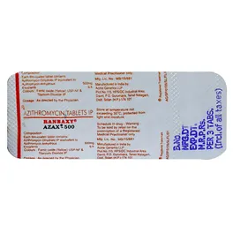 Azax 500 Tablet is an antibiotic used to treat various types of bacterial infections of the respiratory tract, ear, nose, throat, lungs, skin, and eye in adults and children. It is also effective in typhoid fever and some sexually transmitted diseases like gonorrhea.