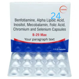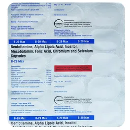 B 29Max Capsule is a combination of Methylcobalamin, Alpha Lipoic Acid, Myo-Inositol, Folic Acid, Chromium Picolinate, Selenium, and Benfotiamine. Methylcobalamin is a form of vitamin B12 that restores its level in the body thereby helping in treating certain anemias and nerve problems. Alpha lipoic acid acts as a potent antioxidant (substance that protects against cell damage) by neutralizing the free radicals (waste products formed in the body during energy production) such as reactive oxygen and nitrogen species. Further, it initiates natural antioxidant processes in the body. It also maintains the levels of Vitamin E and Vitamin C in the body. Myo-inositol works by relaxing the blood vessels and improving blood flow to the legs, toes and fingers, thereby relieving pain. Folic Acid is a form of vitamin B. It plays a vital role in the formation of red blood cells, which carry oxygen throughout the body. It is also essential in pregnancy due to its role in the development of the unborn baby’s brain and spinal cord. Chromium Picolinate, Selenium, and Benfotiamine are nutritional supplements that provide essential nutrients to our body and improve overall health.