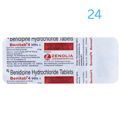 Benitab 4mg Tablet belongs to a class of medicines known as calcium channel blockers. It is used to treat high blood pressure (hypertension) and prevent angina (heart-related chest pain). It lowers blood pressure and reduces the heart’s workload, which helps prevent heart attacks and strokes.