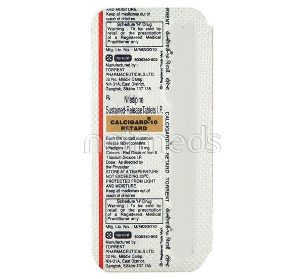 CALCIGARD RETARD 10MG TABLET contains Nifedipine, which belongs to the group of medicines called Antihypertensive drugs. It is used in the management of high blood pressure (hypertension) and angina. Hypertension is a condition in which the force of the blood against the blood vessel walls is too high and is characterised by headache, irregular heartbeat, vision changes, a feeling of overtiredness, nausea, vomiting, confusion, anxiety, and chest pain. Angina is a type of chest pain caused by reduced blood flow to the heart and characterised by a squeezing type of pain, pressure, heaviness, and tightness in the chest.