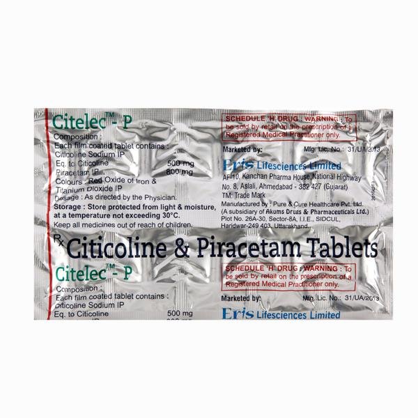 CITELEC P 500/800MG TABLET contains two medicines namely citicoline and piracetam. Citicoline is a neuroprotectant. It protects the nerve cells by blocking the release of certain chemicals (such as glutamate and other free radicals) within the brain and nervous system that damages the nerve cells.