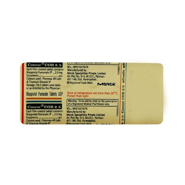 Before taking Concor COR 2.5 Tablet, let your doctor know if you have any liver problems. It may also not be suitable for people who have a slow heart rate, severe circulation problems, severe heart failure, or low blood pressure. Pregnant or breastfeeding women should also consult their doctor before taking it. Have your blood pressure checked regularly to ensure the efficacy of the treatment. Avoid drinking alcohol as it may increase certain side effects.