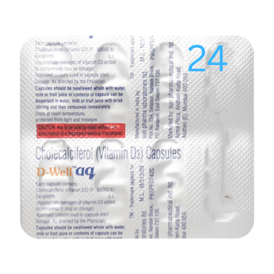 D-Well AQ Capsule is used in the treatment of vitamin D deficiency and osteoporosis. It helps the body to absorb calcium. Calcium is essential for maintaining strong and healthy bones. It is used when your diet does not provide enough calcium.