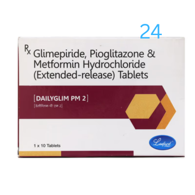 Dailyglim PM 2 Tablet is a combination of three antidiabetic medicines: Glimepiride, Metformin and Pioglitazone. They work by different mechanisms to provide better control of blood sugar when single or dual therapy is not effective. Glimepiride is a sulfonylurea which works by increasing the amount of insulin released by the pancreas in order to lower the blood glucose. Metformin is a biguanide. It works by lowering glucose production in the liver, delaying glucose absorption from intestines and increasing the body’s sensitivity to insulin. Pioglitazone is a thiazolidinedione which further increases insulin sensitivity.