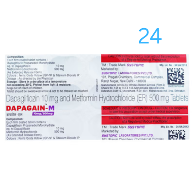 Dapagain-M 10mg/500mg Tablet ER is a combination of two antidiabetic medicines: Dapagliflozin and Metformin. Dapagliflozin works by removing excess sugar (glucose) from your body through urine. Metformin works by lowering sugar production in the liver, delaying glucose absorption from the intestines, and increasing the body’s sensitivity to insulin. Together, they provide better control of blood sugar.
