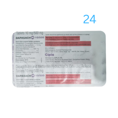 dapaSACH – M 10mg/500mg Tablet is a combination of two medicines used to treat type 2 diabetes mellitus. It helps control the high blood sugar levels seen in diabetes. This reduces the chances of serious complications of diabetes and also helps prevent heart disease.