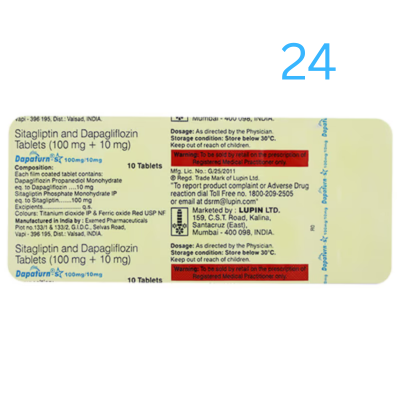 Dapaturn-S 10mg/100mg Tablet is a combination of two antidiabetic medications. Dapagliflozin increases urinary glucose excretion and reduces blood glucose levels. Sitagliptin reduces the amount of glucose produced by the liver by raising insulin levels and decreasing the levels of glucagon (the hormone that increases blood glucose levels).