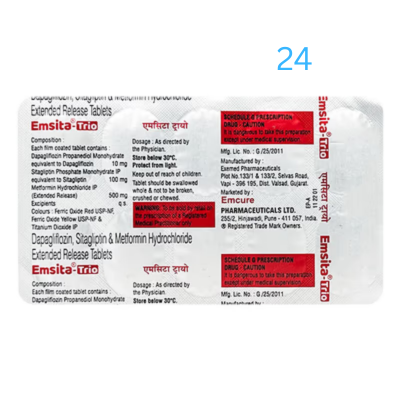 Emsita Trio 10mg/500mg/100mg Tablet ER can be taken with or without food at any time of the day, but try to take it at the same time every day. The dose will be decided by your doctor, so do not stop taking it without asking them. If you do, your blood sugar levels may increase your risk of serious complications like kidney damage and blindness. This medicine is only a part of the treatment program that should include a healthy diet, regular exercise, and weight reduction as advised by your doctor.