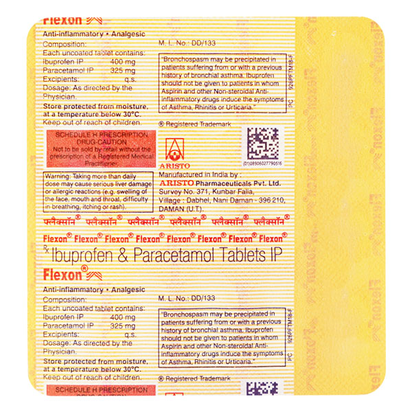 FLEXON TABLET is a combination of Ibuprofen and Paracetamol, which belongs to the group of medicines called Non-steroidal anti-inflammatory drugs (NSAIDs) and Analgesics respectively. It is used to manage minor aches and pains such as headaches, toothaches, muscular aches, backaches, pain due to inflammation and for reduction of fever due to any of the above conditions in adults and children aged 12 years and above. Analgesics help to reduce fever.