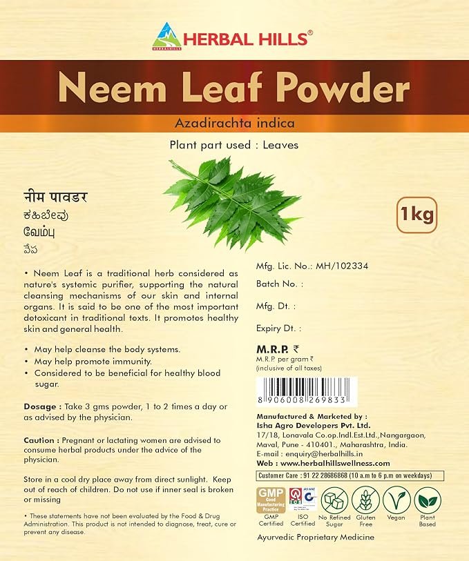 Neem Leaf, also called Azadirachta indica, is synergistically processed with highly advanced technology. Herbalhills is India’s largest online selling brand in pure herb powders. Herbalhills products are made out of best quality and authentic ayurvedic herbs, available in India. These herbs are specially selected and manually graded to give the best products. The quality and efficacy is 100% guaranteed. Herbalhills Neem leaf powder can be used for ayurvedic and cosmetic purposes. Herbalhills neem powder may act as a body cleanser, blood purifier, support immunity and liver health.