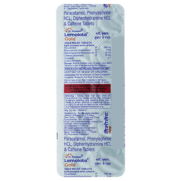 LEMOLATE GOLD TABLET is a combination of Caffeine, Diphenhydramine, Paracetamol, and Phenylephrine which belongs to the group of medicines called CNS Stimulants, Antihistamines, Analgesics-Antipyretics, and Nasal Decongestants respectively. It is used to relieve flu and cold symptoms, headache, body ache, extreme weakness, watery eyes, fever, cough, sore throat, sneezing, runny, and congested nose.
