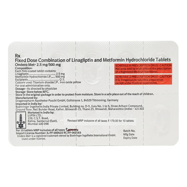 ONDERO MET 2.5/500MG TABLET is a combination medicine (Metformin and Linagliptin) used to manage type II diabetes mellitus among adult patients when diet, exercise and management with other conventional medicines does not result in adequate sugar control. It is used as an adjunct therapy along with proper diet and exercise to achieve better results.