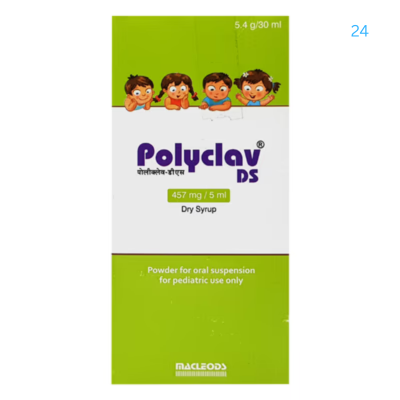 Polyclav-DS Dry Syrup is an antibiotic medicine that helps treat bacterial infections of the ear, nose, throat, chest, lungs, teeth, skin, and urinary tract. It is capable of killing bacteria that have become resistant to other therapies and thus also helps treat tuberculosis that is resistant to other treatments.
