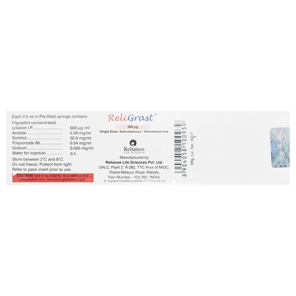 RELIGRAST 300MCG PREFILLED SYRINGE(PFS) works by stimulating the bone marrow to produce more neutrophils (type of white blood cell) which helps in fighting the microorganisms and manage the occurrence of infection after chemotherapy/bone marrow transplant in affected individuals.