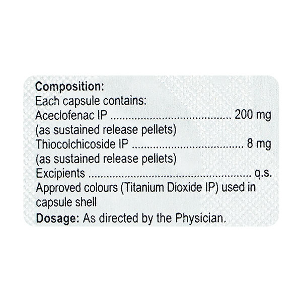 THIOX OD 8MG CAPSULE is a muscle relaxant with anti-inflammatory and analgesic properties. It effectively reduces pain caused by muscle spasms and inflammatory bone disorders, where aceclofenac acts by blocking the release of certain chemicals (prostaglandins) that cause pain and inflammation in the body and thiocolchicoside acts by blocking the effects of certain chemical messengers (GABA) in the brain that cause painful muscle spasms. Collectively, THIOX OD 8MG CAPSULE relieves painful muscle spasms associated with inflammatory disease conditions.