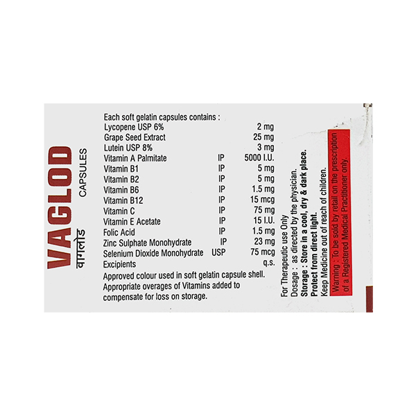Vaglod Capsule is a vitamin supplement that is used to manage various health issues and make a balanced healthy lifestyle. It contains grape seed extract, lycopene, lutein, vitamins and minerals as active ingredients which are necessary for the body growth.