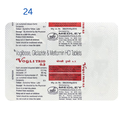 VOGLITRIO 0.2MG TABLET works effectively against diabetes, where Gliclazide acts by stimulating the secretion of insulin (a hormone that signals throughout the body to absorb glucose and regulate the blood sugar level) through beta-cell sulphonyl urea receptors. Metformin works by decreasing glucose production in the liver (gluconeogenesis) and increasing insulin sensitivity to absorb glucose. Voglibose inhibits the alpha-glucosidase in the intestine and manages the absorption of glucose from food, thereby reducing the blood sugar level.