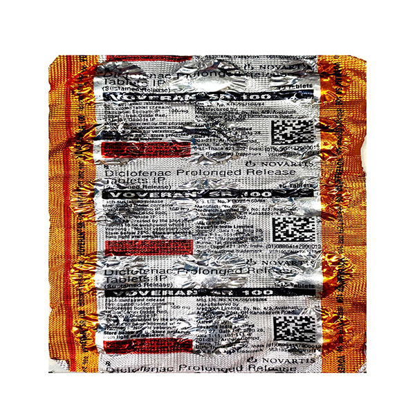 VOVERAN SR 100MG TABLET contains Diclofenac, which belongs to the group of medicines called Nonsteroidal Anti-Inflammatory Drugs (NSAIDs). It is used to manage pain and inflammation related to sprains, strains, and other injuries post-surgery, gout (excessive uric acid accumulation in joints), backache, rheumatoid arthritis (immune system attack on healthy cells by mistake, causing inflammation), osteoarthritis (flexible tissue at the ends of bones wears down), ankylosing spondylitis (spine inflammation), and pyrophosphate arthropathy (crystals of a calcium salt causing joint problems).
