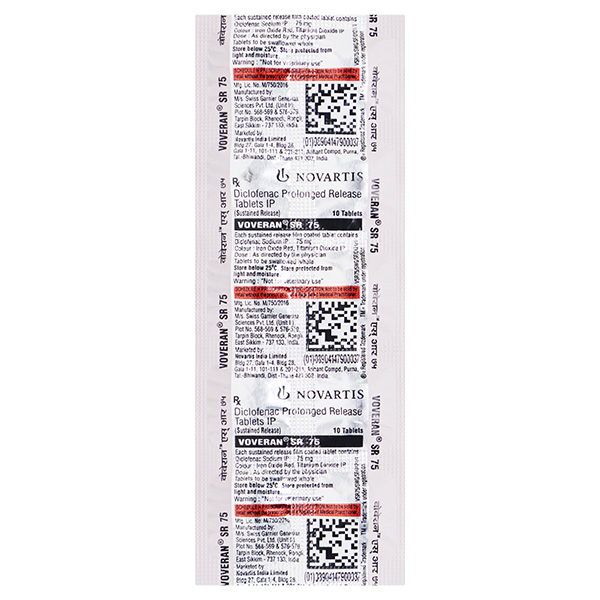 VOVERAN SR 75MG TABLET contains Diclofenac, which belongs to the group of medicines called Nonsteroidal Anti-Inflammatory Drugs (NSAIDs). It is used to manage pain and inflammation related to sprains, strains, and other injuries post-surgery, gout (excessive uric acid accumulation in joints), backache, rheumatoid arthritis (immune system attack on healthy cells by mistake, causing inflammation), osteoarthritis (flexible tissue at the ends of bones wears down), ankylosing spondylitis (spine inflammation), and pyrophosphate arthropathy (crystals of a calcium salt causing joint problems).