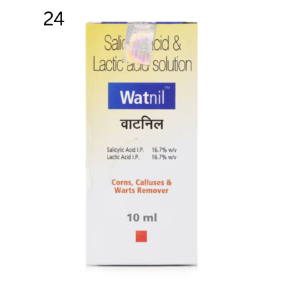 WATNIL SOLUTION contains Lactic Acid and Salicylic Acid that work in cases of corn and calluses by softening the hardened skin growth so that it can be it easily removed with the help of a pumice stone or emery board. This medicine also helps in reducing the infection and spread to other parts of skin by killing the virus that causes warts and verrucae.